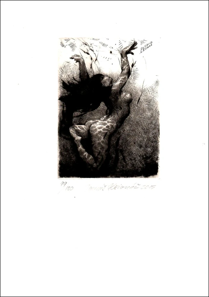 Autor zde vyniká zejména v práci s figurou a aktem, které zpracovává s jistotou a výrazovou čistotou v technice suché jehly. Jemná linie a citlivá modelace dodávají grafice hloubku a autenticitu.