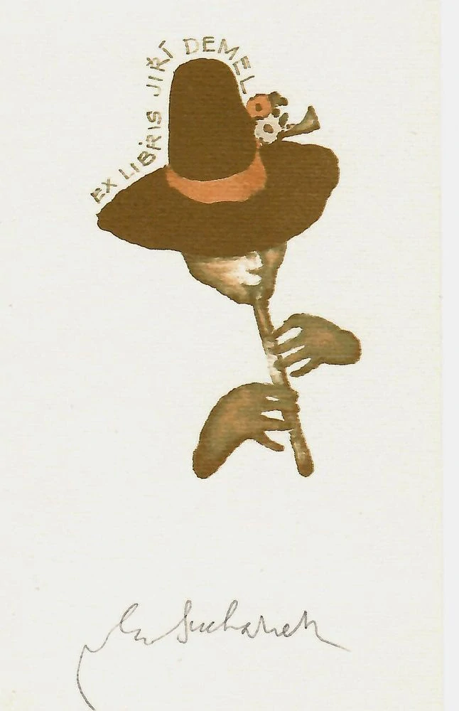 Komorní grafika Vladimíra Suchánka s motivem stylizovaného muzikanta představuje typickou ukázku autorova rukopisu – jednoduchého, hravého a zároveň výtvarně přesvědčivého.