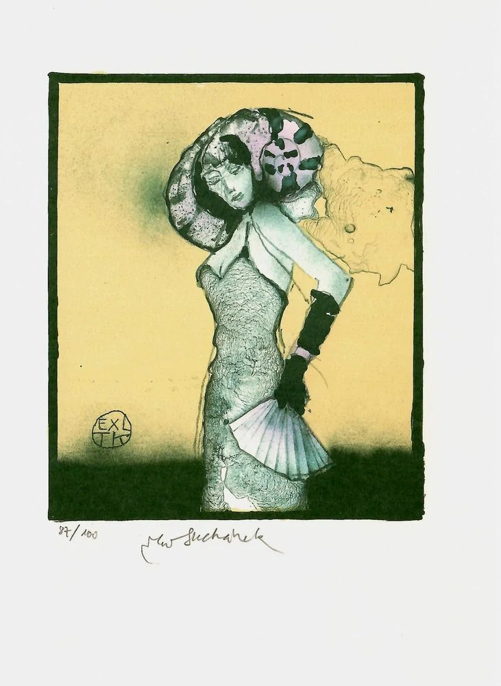 Litografie Vladimíra Suchánka s motivem ženské postavy s vějířem patří k typickým ukázkám autorovy tvorby, kde se spojuje elegance figury s dekorativní stylizací.